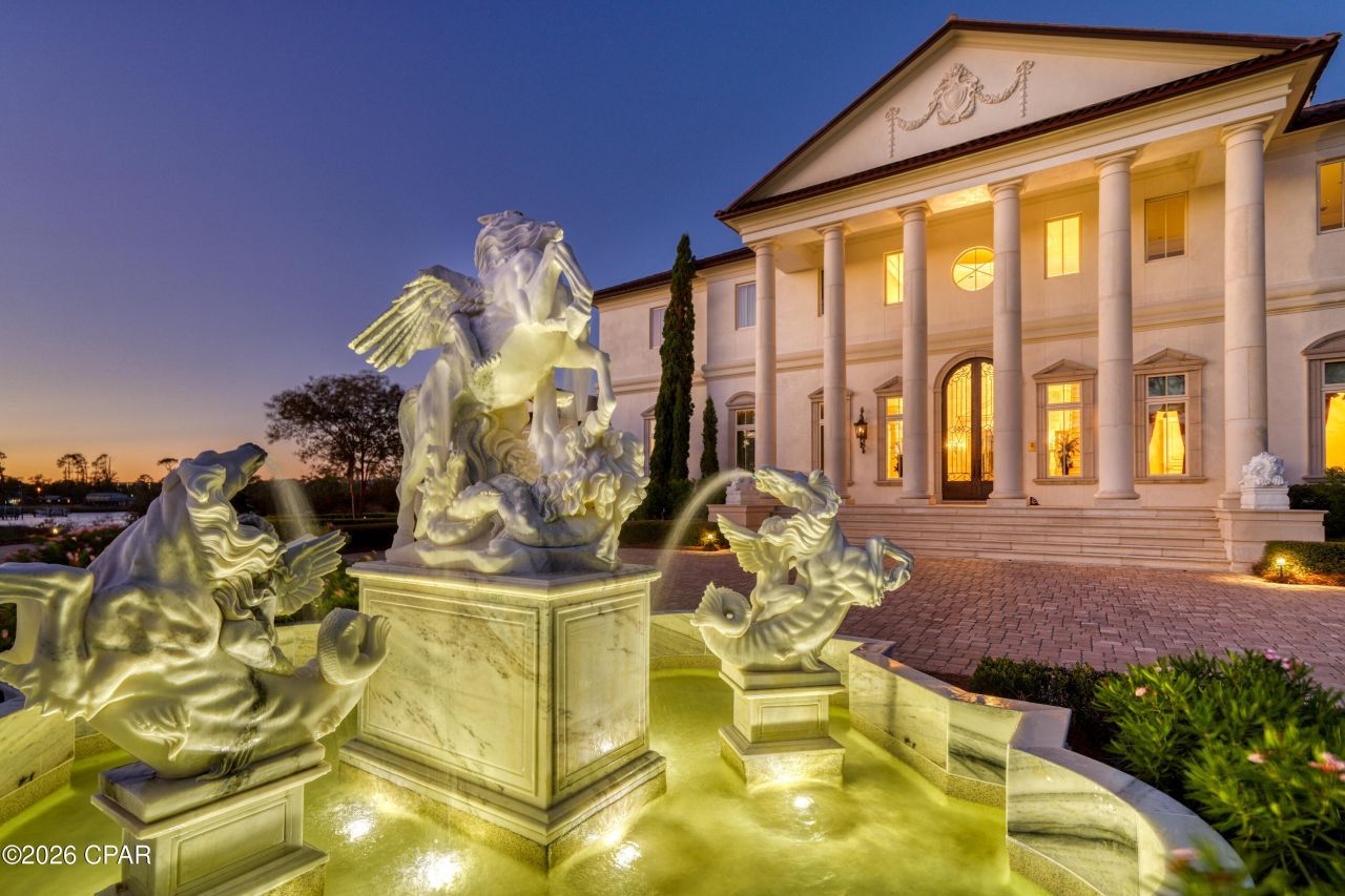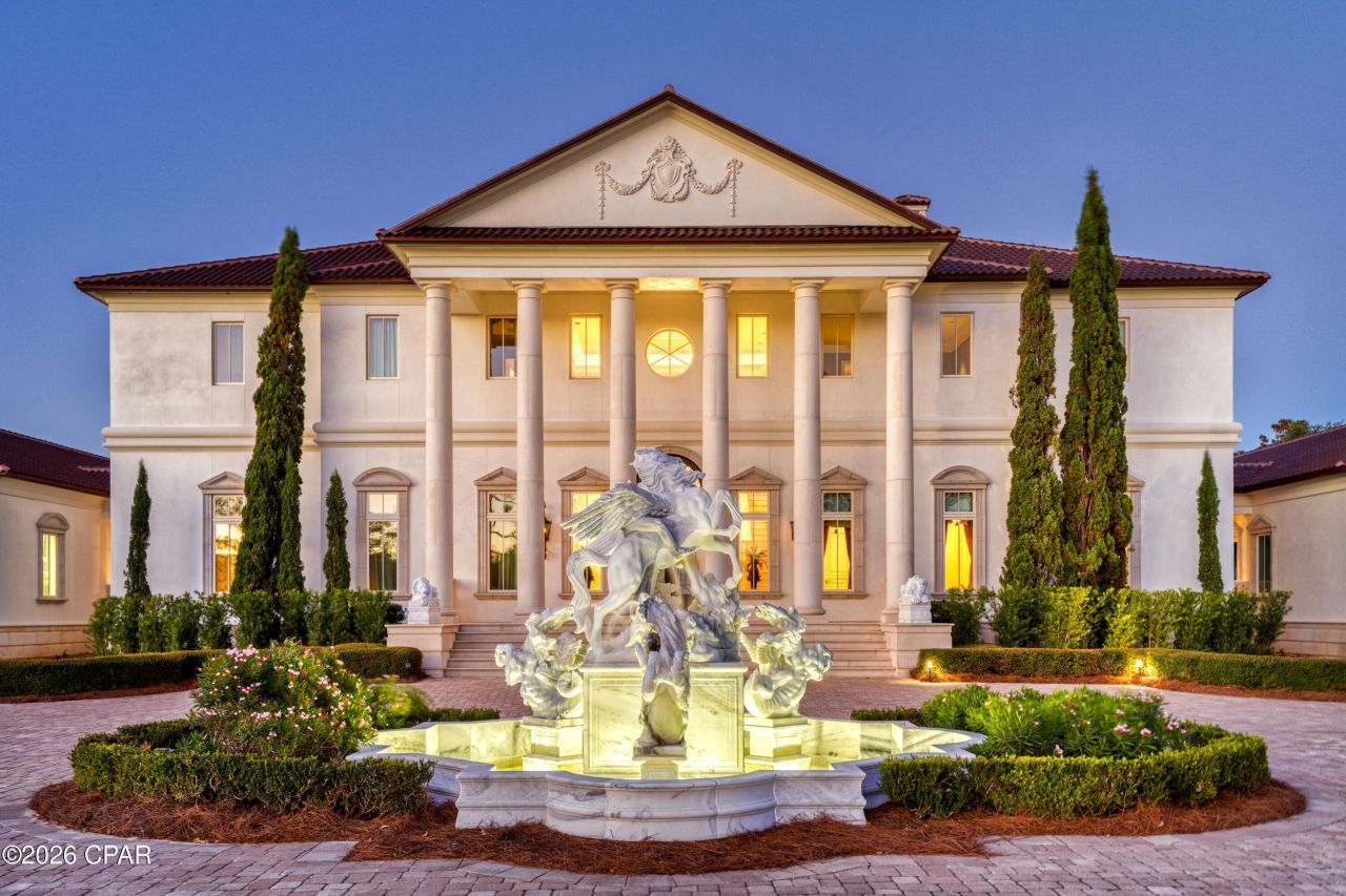 Perched on 380 feet of pristine West Bay waterfront along the Northwest Florida Gulf Coast, Villa Chimera is the most extraordinary luxury estate in Panama City Beach. Spanning 9,473 sq. ft. across three expansive lots, this 5BR/6BA/4HB masterpiece was authentically modeled after an Italian Venetian Palazzo -- designed by architect Philip Spann from hand-sketched owner drawings inspired by Renaissance master Andrea Palladio. Every finish was sourced from Italy or crafted by world-renowned artisans: a hand-carved Italian marble fountain, cushion-cut marble walls, Venetian silk upholstery, a Rome-crafted stone dining table, and a Renaissance fresco ceiling hand-painted by artist Jody Matokovich. This is not simply a Gulf Coast luxury home -- it is a one-of-a-kind legacy estate. The soaring foyer commands immediate attention with its grand Schonbek crystal chandelier, custom compass rose marble floor inlay, and solid stone staircase with marble balusters. The great room overlooking West Bay features a marble fireplace, limestone accents, and walls upholstered in Bevilacqua silk -- made in Venice and renowned worldwide. A media room with a theater-size projection screen and theatrical lighting flows seamlessly from the living space. The gourmet kitchen features Wolf and Sub-Zero appliances, a breakfast bar, separate bar area, and a fully equipped butler's pantry for effortless large-scale entertaining. All cabinetry was custom-designed by Design Galleria of Atlanta. The dining room centers around a custom stone table crafted in Rome outside the Vatican walls, beneath Venetian watermark plasterwork evoking centuries of Palazzo history. The second-level master suite is a private sanctuary with bay views, a columned balcony, and a hand-painted Renaissance fresco vault ceiling. Separate his-and-hers bathrooms each feature heated floors and double showers with body jets. A detached guest house -- connected by covered walkway -- includes a full kitchen, sitting area, private veranda, and full bath. Smart home living is delivered via a full Crestron system controlling all lighting, media, and security. Additional highlights: Kohler 100KW whole-house generator, all-copper plumbing, 4-car garage with wheelchair lift, whole-house central vacuum, monitored security cameras, LED lighting throughout, and all windows and exterior doors replaced post-Hurricane Michael. A rare and irreplaceable Florida Gulf Coast waterfront estate -- schedule your private showing today.
